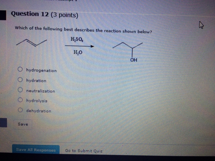 Which Of The Following Best Describes The Reaction Shown Below A Hydrogenation B Hydration C Neutralization D Hydrolysis E Dehydration Study Com